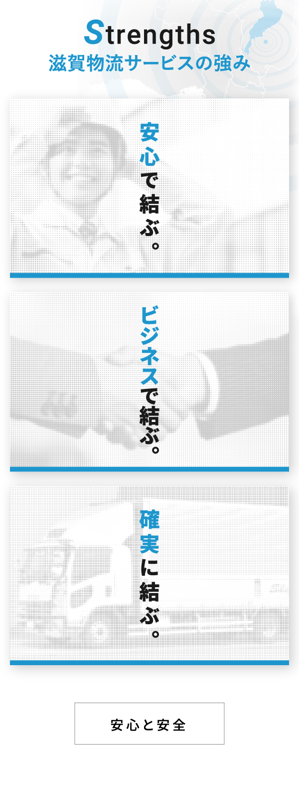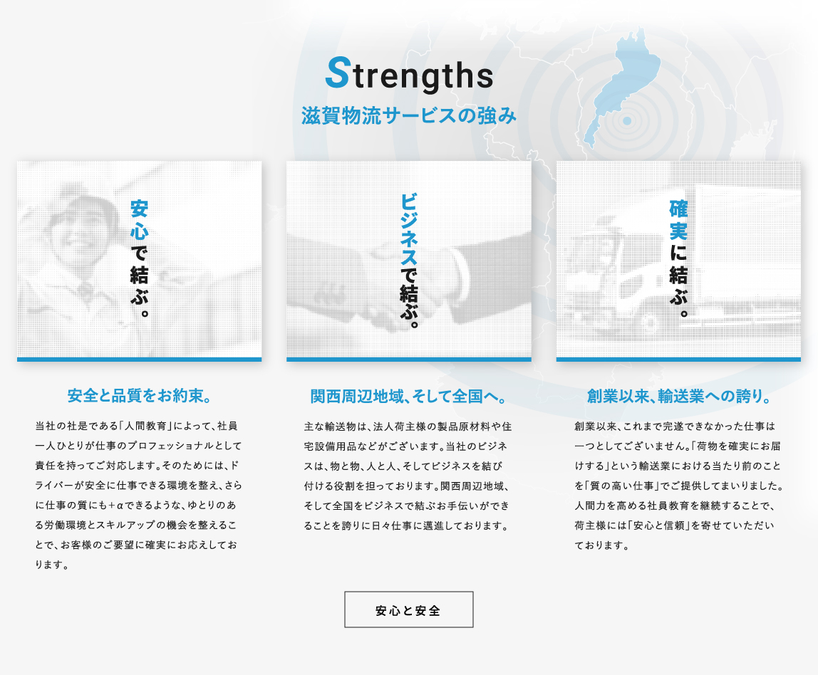 滋賀物流サービスの会社概要についてご紹介いたします。会社概要や社屋、倉庫の施設紹介、取得免許、沿革はこちらからご覧ください。私たちは輸送業において「確実に運び届ける」ことを大切に関西を、その周辺地域を、そして全国を結び、ビジネスを活性化させる役割を担っています。