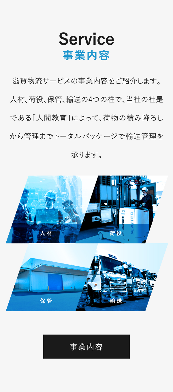 滋賀物流サービスでは、礼節を重んじる社員教育をもとに”物を運ぶのは「トラック」ではなく、そこに携わる「人間」である”という先代からの教えを引き継ぎ、人間力を高めることで常に誠実で丁寧な仕事を心掛けています。風通しの良い職場から、確かなチームワークで荷主様の信頼を得る仕事をご提供してまいります。